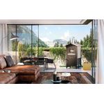 Der Türrahmen ist in Edelstahl gefertigt und damit hochwertig und langlebig für den Outdoor-Einsatz. Ein einfach zu bedienendes Rauch-Regelventil ist formschön installiert. Ebenfalls mit dabei ist Die Temperaturanzeige.